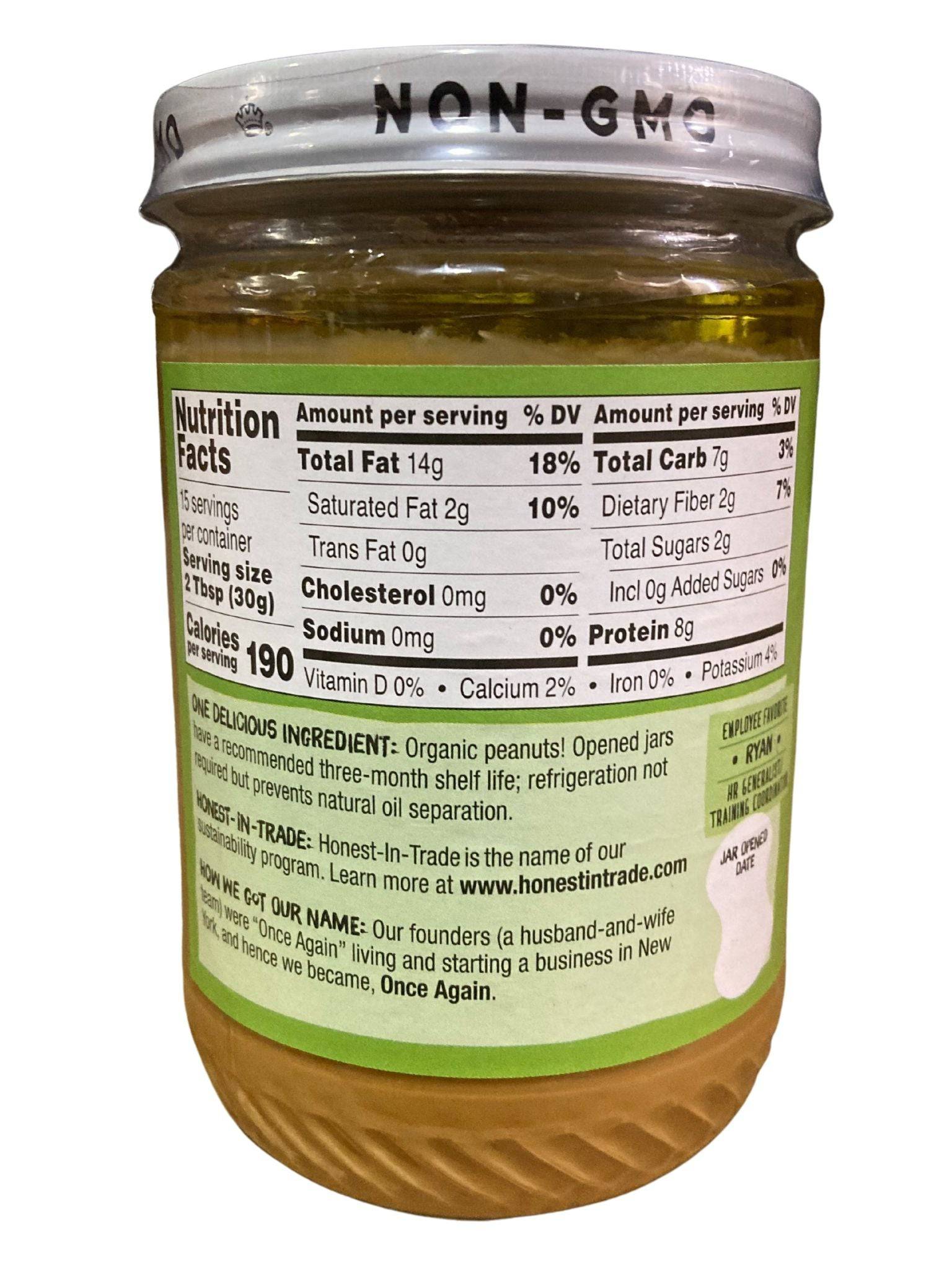 *Manufactured by Once Again Nut Butter Company, and may contain trace amounts of other nuts, peanuts, and seeds. Salt is added only where indicated. No hydrogenated oil, preservatives, or sugar is added. Occasionally, because of the natural manufacturing process and the lack of artificial ingredients, the nut butter may separate from the oil. To restore, simply stir the contents together with a metal utensil. Heating the jar slightly may help the stirring process.